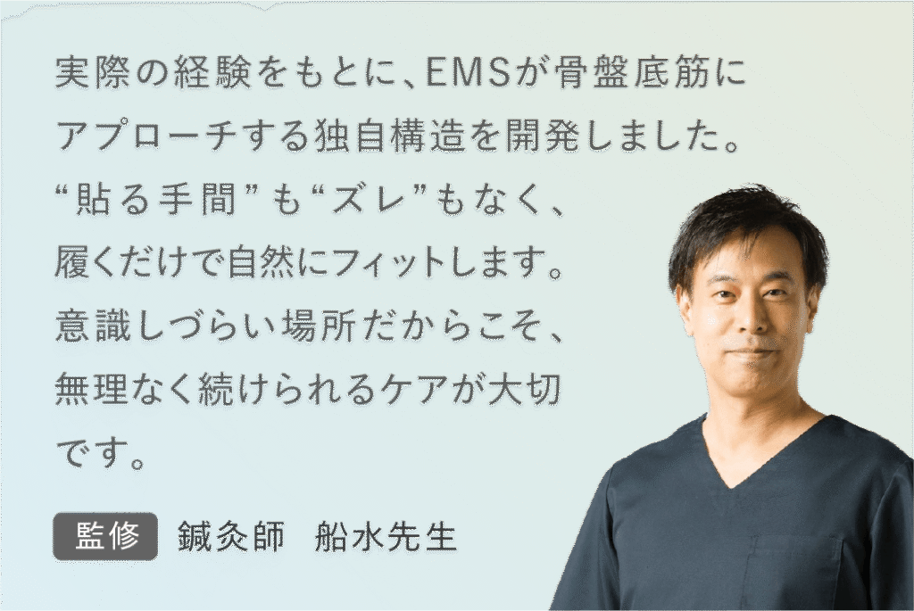 鍼灸師監修のもと、EMSが骨盤底筋にアプローチする独自構造です。 “貼る手間”も“ズレ”もなく、履くだけで自然にセッティング